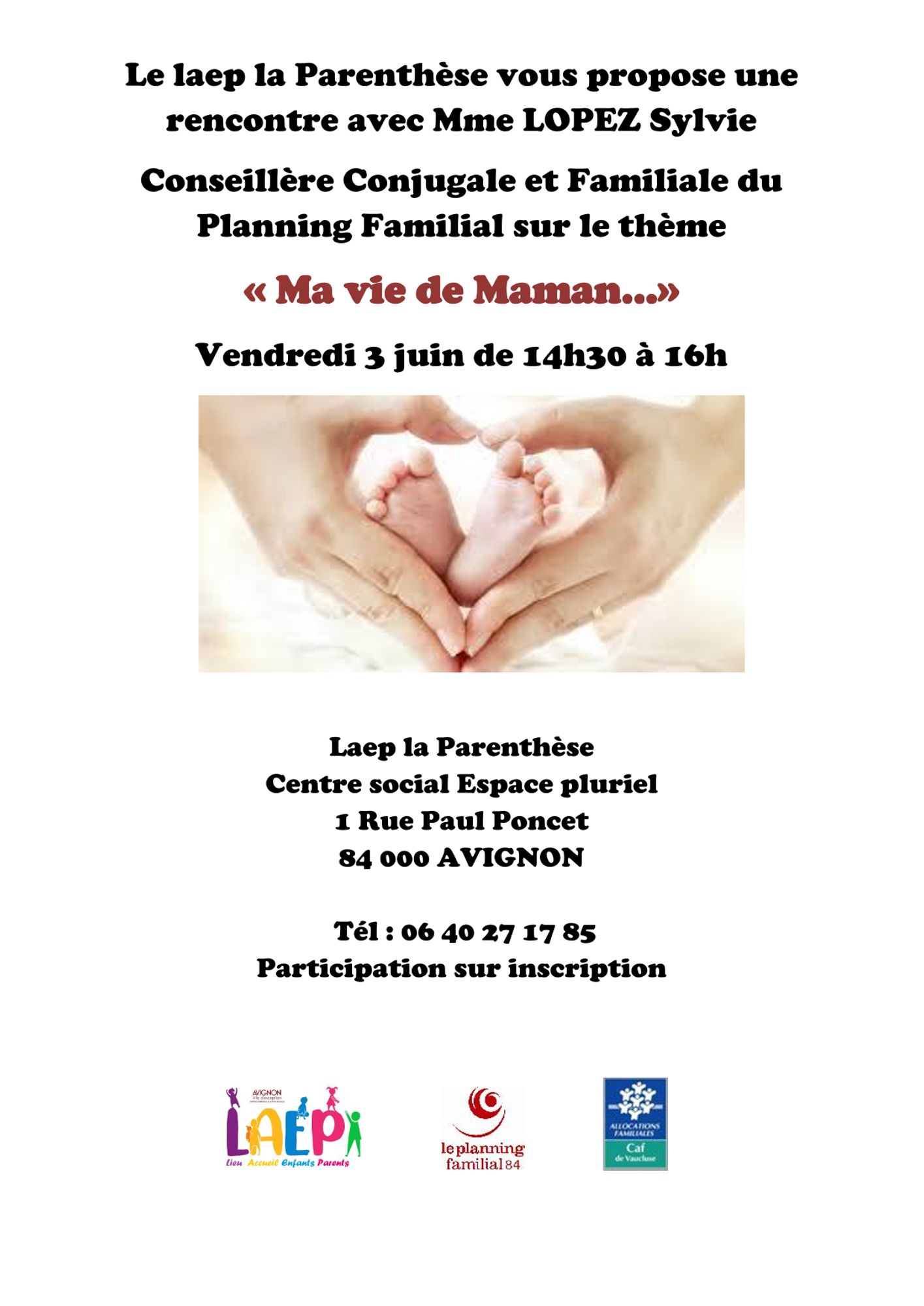 Organisée par le Lieux d’accueil enfant parent – LAEP La Parenthèse à Avignon, La rencontre sur le thème "Ma vie de Maman.." sera animé par Mme LOPEZ Sylvie, Conseillère Conjugale et Familiale du Planning Familial.