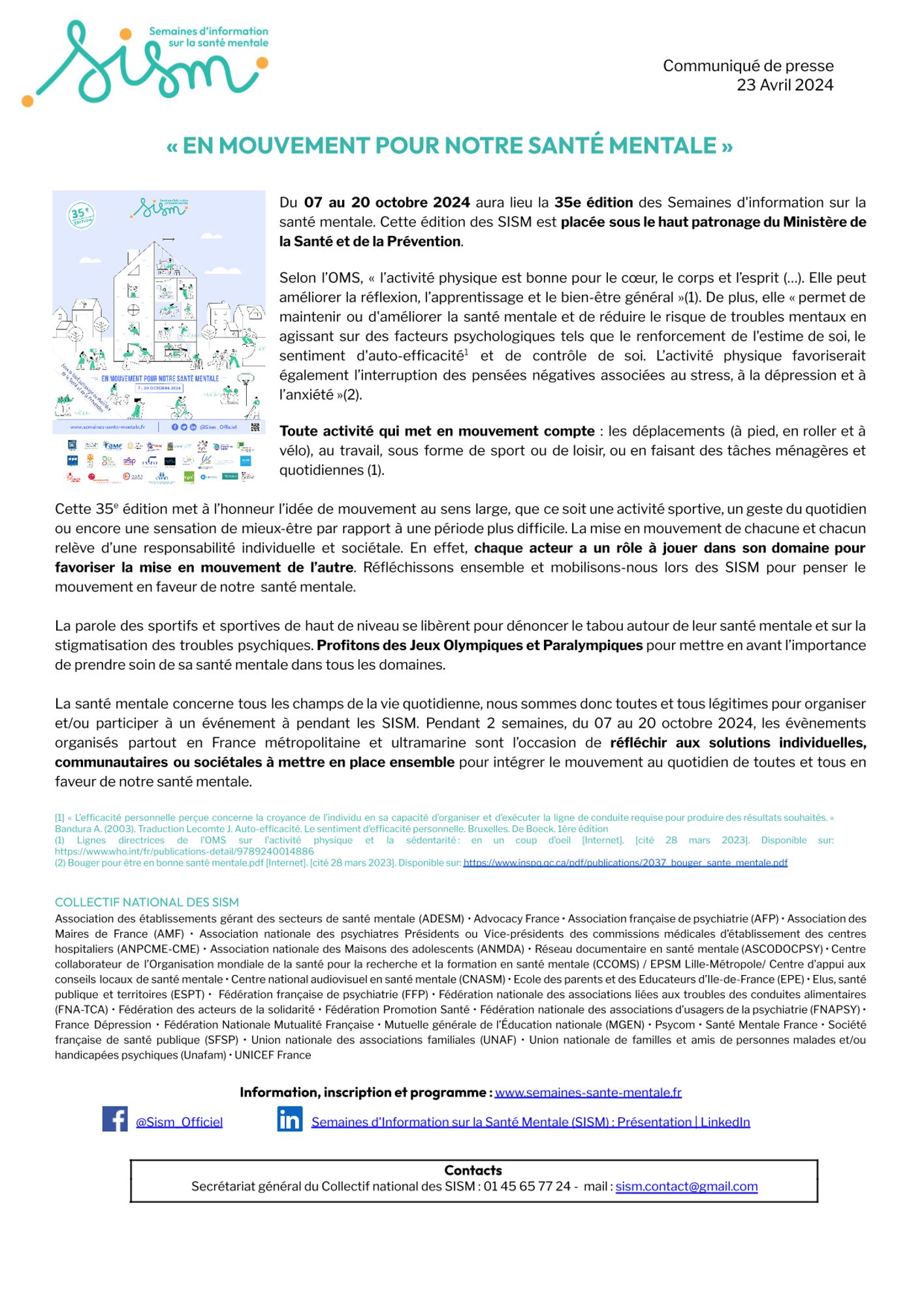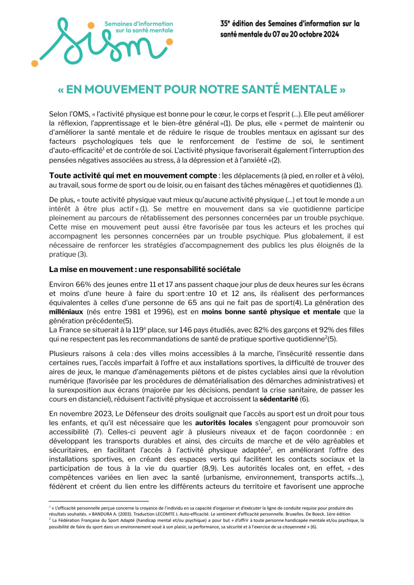 En 2024, dans le contexte des Jeux olympiques de Paris, les SISM ont choisi la thématique de l'activité physique en la reliant à la santé communautaire avec pour argument que le soutien social et l’intégration sociale "pourraient favoriser positivement la santé mentale et (…) aussi expliquer la réduction du risque de développer des troubles mentaux".