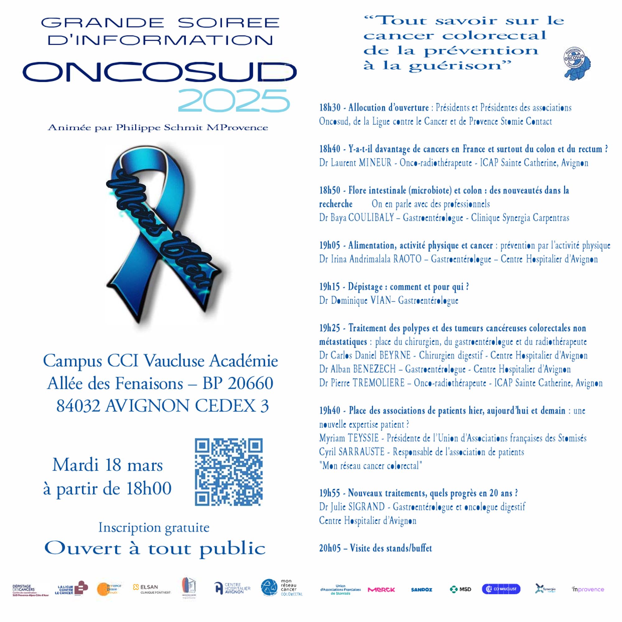 A l'occasion de Mars bleu, Oncosud organise une soirée pour sensibiliser, informer et répondre à toutes les questions sur le cancer colorectal, ses facteurs de risque, les méthodes de prévention et les traitements disponibles. Elle aura lieu le :