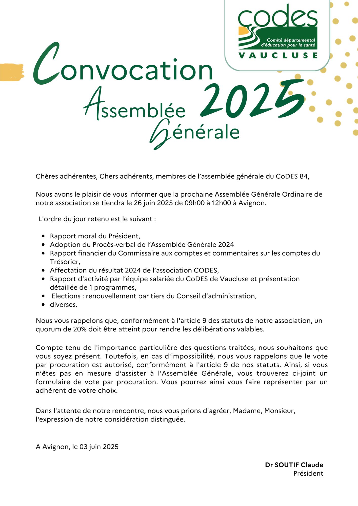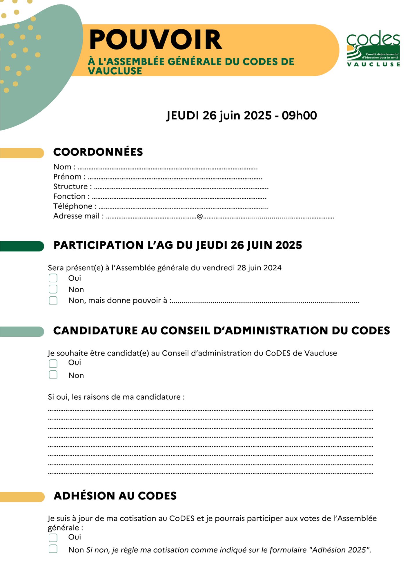 Assemblée générale 2025 du CoDES 84. Ordre du jour et documents utiles