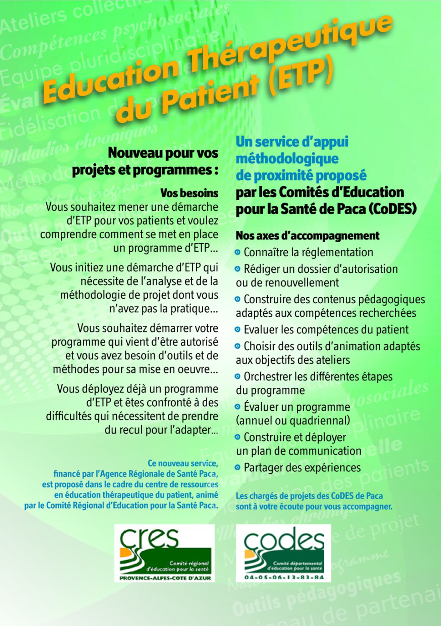 Depuis le mois d'octobre 2016, à la demande de l'ARS et du CRES Paca, le CoDES de Vaucluse propose une nouvelle mission de soutien aux structures qui déploient des programmes d'ETP ou ont le projet d'en mettre en place.