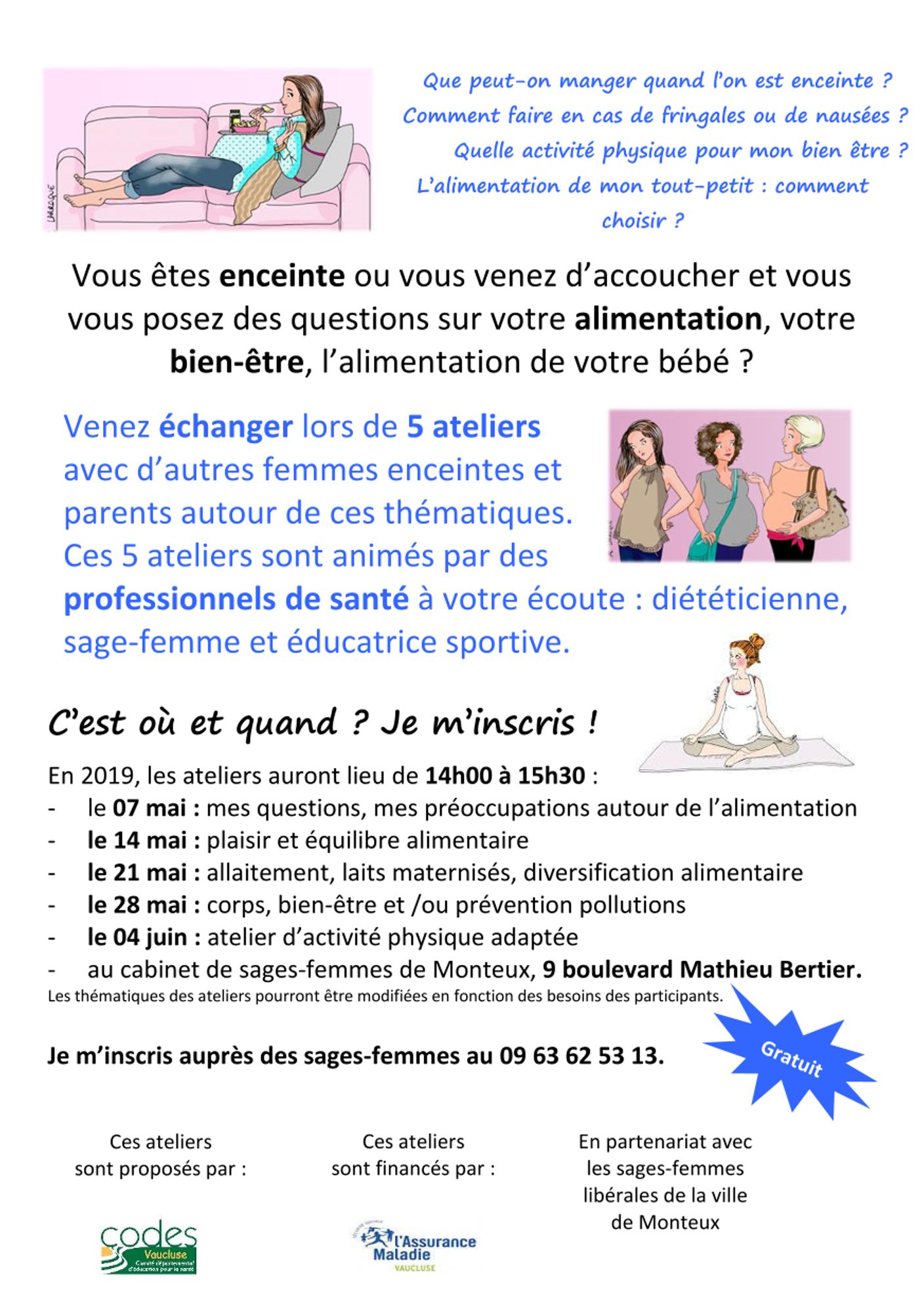 En 2019, 5 ateliers seront proposés à Monteux, de 14h00 à 15h30, en partenariat avec les sages-femmes libérales de la ville de Monteux :