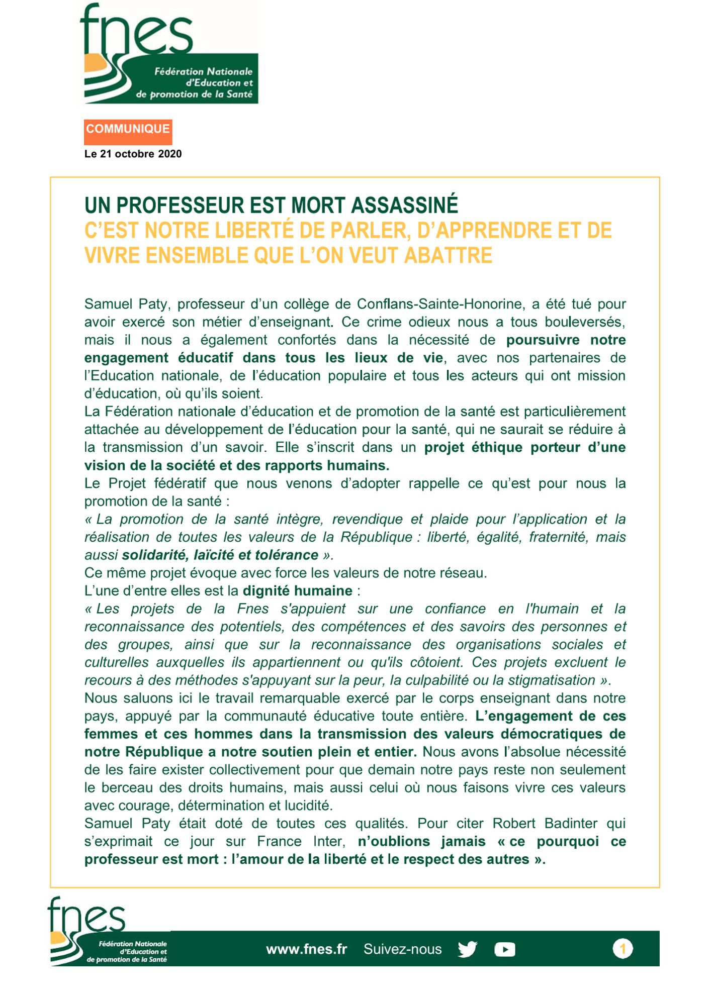 La Fédération Nationale d'Education et de promotion de la Santé (FNES) rend hommage à Samuel Paty Dernière modification : 26 février 2024 Télécharger le communiqué (570.3 Ko)