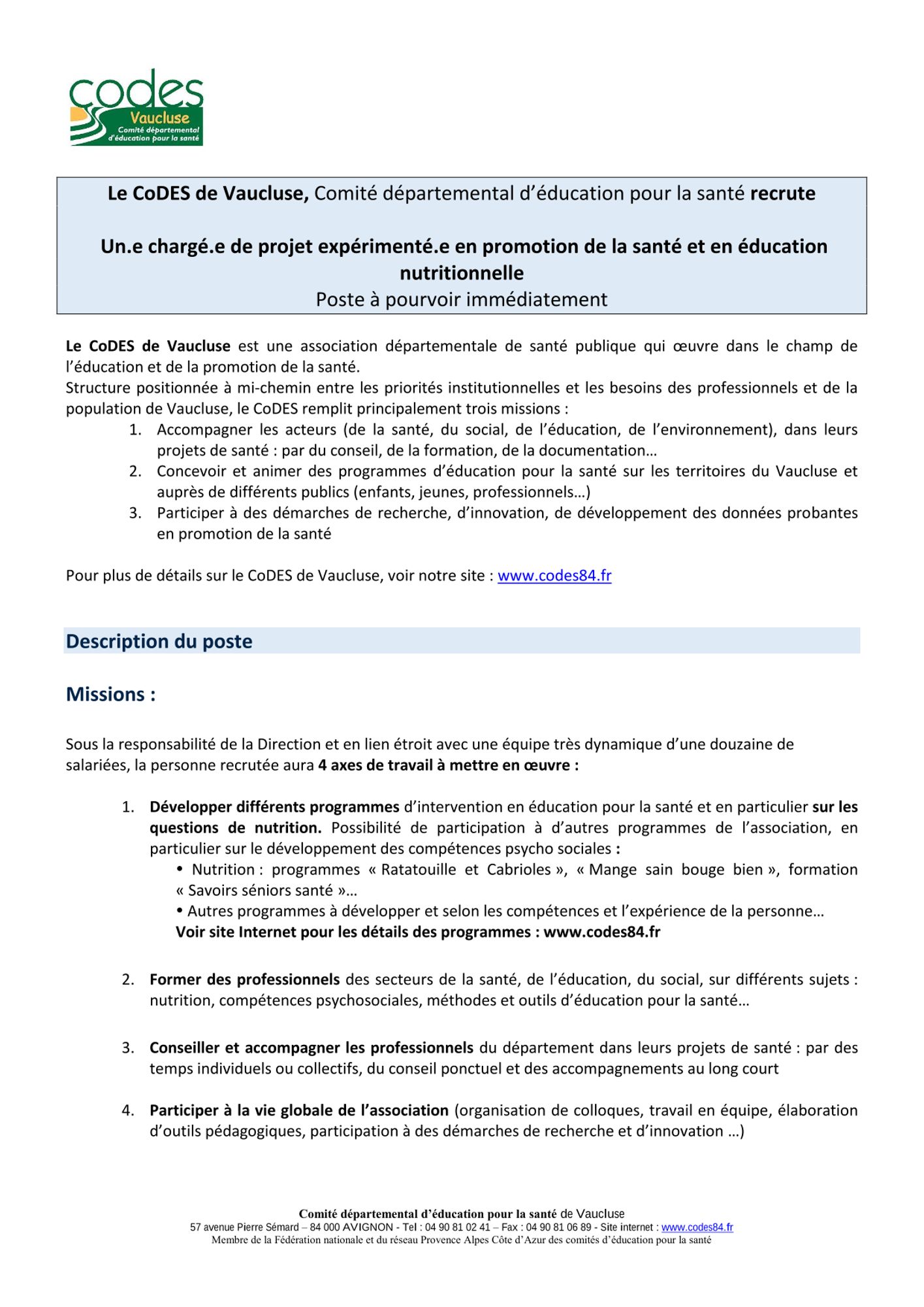 Le CoDES recrute un.e chargé.e de projet expérimenté.e en promotion de la santé et en éducation nutritionnelle