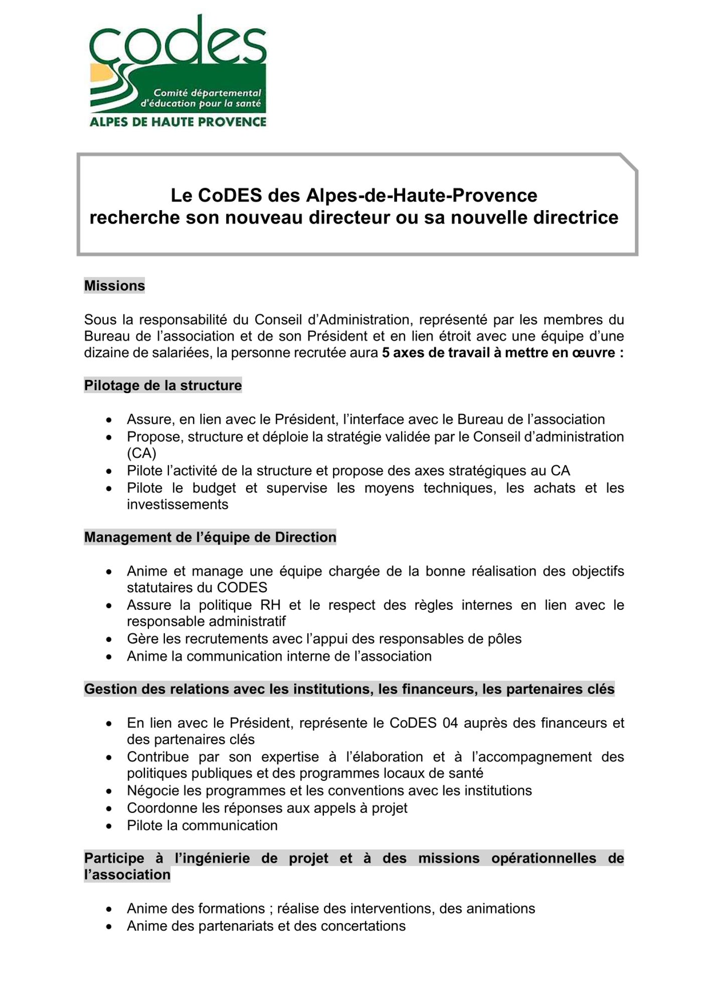 Le CoDES des Alpes-de-Haute-Provence recherche son nouveau directeur ou sa nouvelle directrice