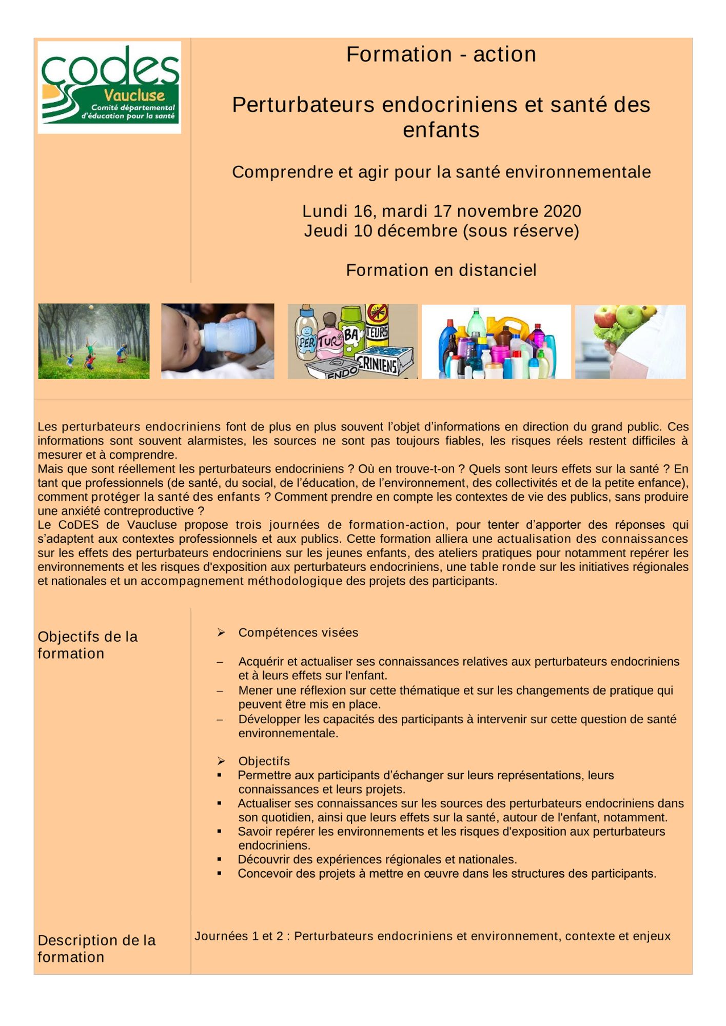 Le CoDES de Vaucluse propose trois journées de formation-action, pour tenter d’apporter des réponses qui s’adaptent aux contextes professionnels et aux publics. Cette formation alliera une actualisation des connaissances sur les effets des perturbateurs endocriniens sur les jeunes enfants, des ateliers pratiques pour notamment repérer les environnements et les risques d'exposition aux perturbateurs endocriniens, une table ronde sur les initiatives régionales et nationales et un accompagnement méthodologique des projets des participants.