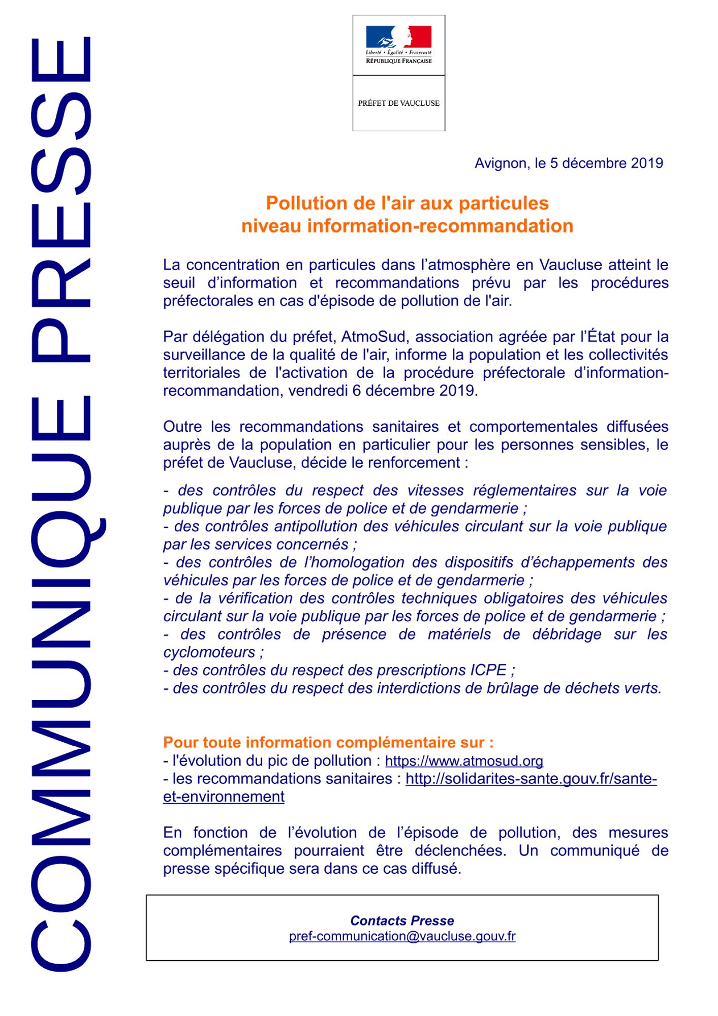 Pollution de l'air aux particules niveau information-recommandation Dernière modification : 26 février 2024 Télécharger le communiqué complet (81.3 Ko)