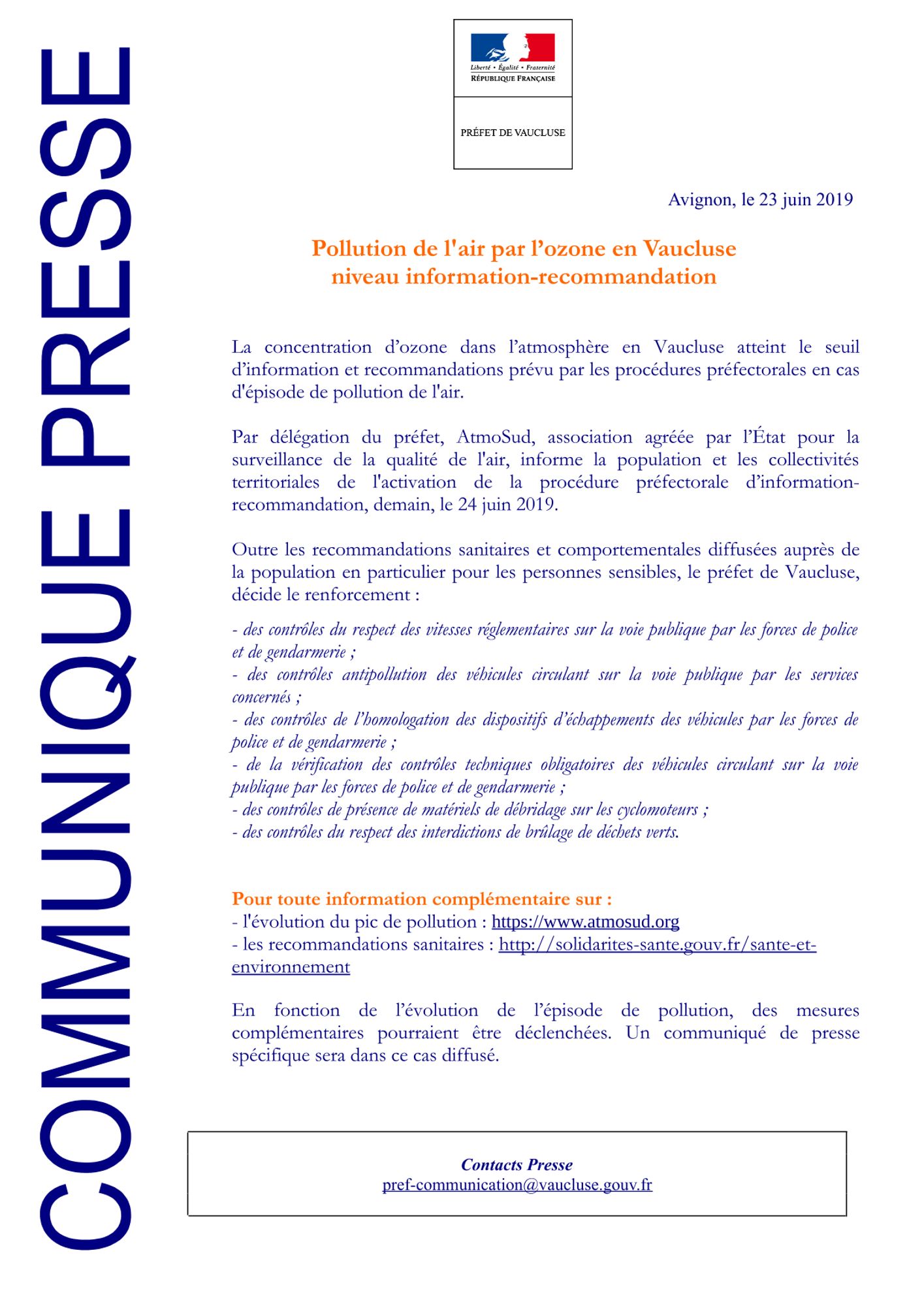 Pollution de l'air par l'ozone en Vaucluse niveau information-recommandation Dernière modification : 26 février 2024 Télécharger le communiqué complet (118.0 Ko)