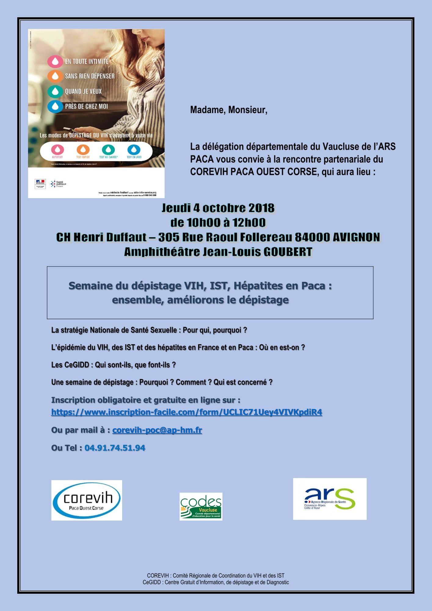 La Délégation Territoriale 84 de l’ARS PACA organise, en partenariat avec le COREVIH PACA OUEST CORSE et le soutien du CoDES 84, un temps d’information et d’échanges sur la semaine de dépistage du VIH, des Hépatites et des IST, qui se déroulera du 26 novembre au 1er décembre 2018.