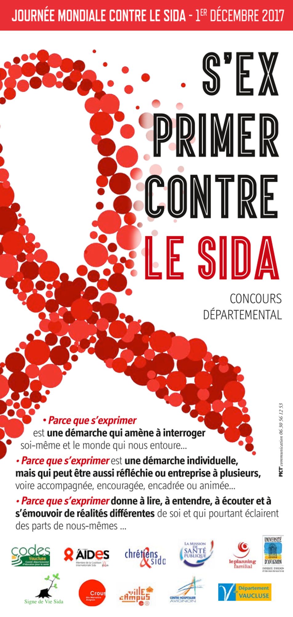 Le CoDES de Vaucluse, Signe de Vie Sida, AIDES, Chrétiens & Sida, le Mouvement français du planning familial, le Conseil départemental de Vaucluse, le Crous et l’Université d’Avignon (Ville Campus), le Centre hospitalier Henri Duffaut et la Mission de santé publique organisent ce concours d'expression pour Amener la population vauclusienne et du «Grand Avignon» à réfléchir à différents enjeux liés à l’épidémie du sida (par exemple : les difficultés du recours au dépistage, la discrimination des personnes touchées, la prévention, la solidarité nécessaire, les prises de risque…).
