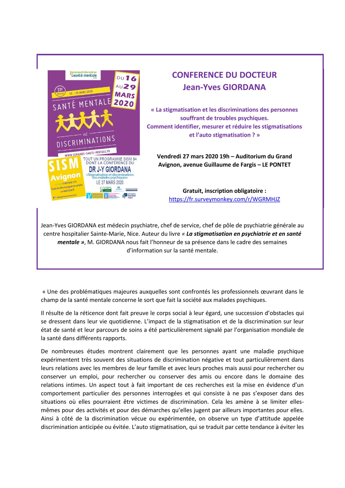 Dans le cadre des Semaines d'information sur la santé mentale - SISM 2020, le Dr Giordana propose une conférence sur "La stigmatisation et les discriminations des personnes souffrant de troubles psychiques. Comment identifier, mesurer et réduire les stigmatisations et l’auto stigmatisation ?"