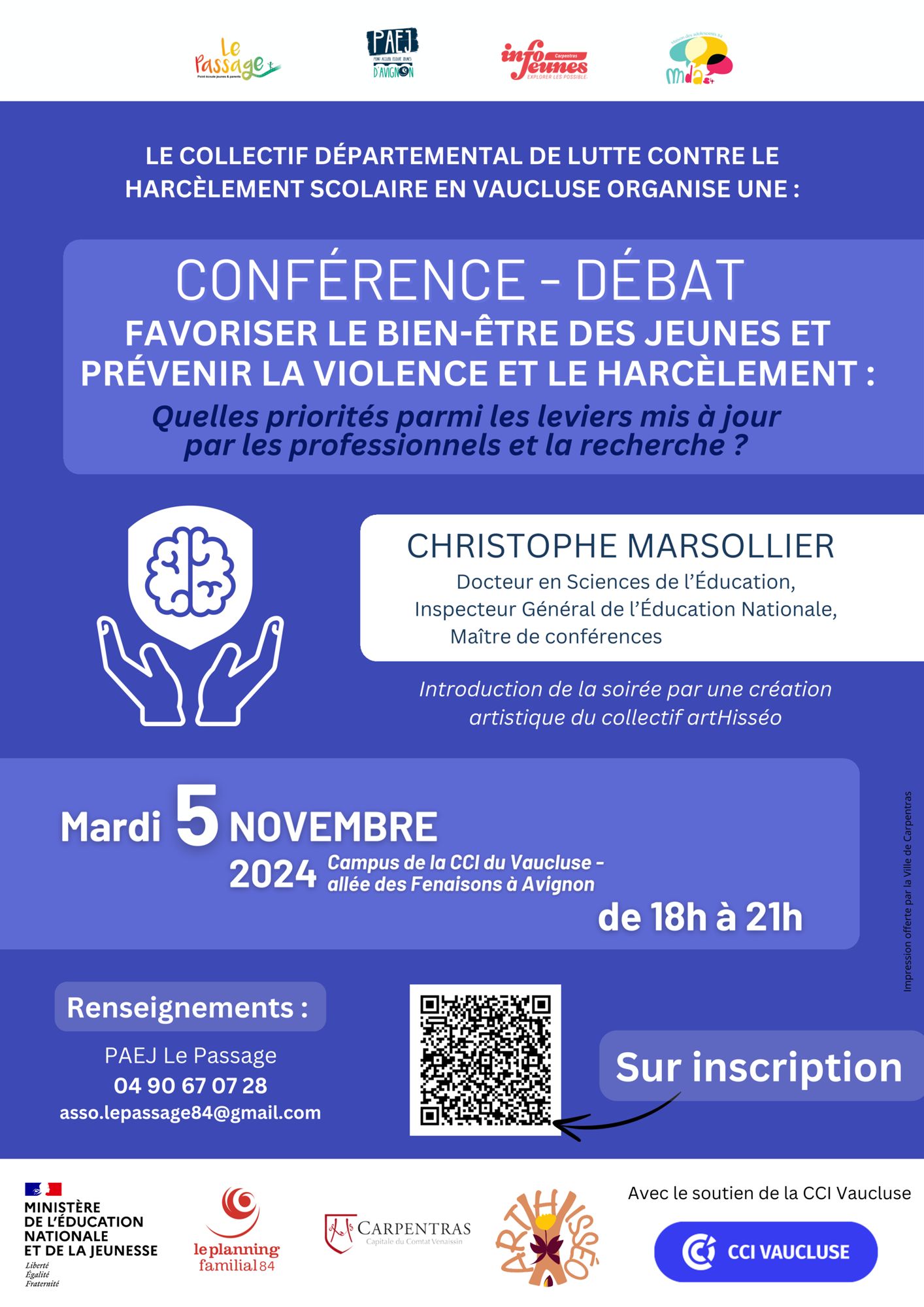 À l’occasion de la Journée nationale de lutte contre le harcèlement scolaire, le collectif vauclusien de lutte contre le harcèlement scolaire a le plaisir de vous inviter à la conférence animée par Christophe Marsollier : "Favoriser le bien-être des jeunes, prévenir la violence et le harcèlement : Quelles priorités parmi les leviers mis à jour par les professionnels et la recherche ?"