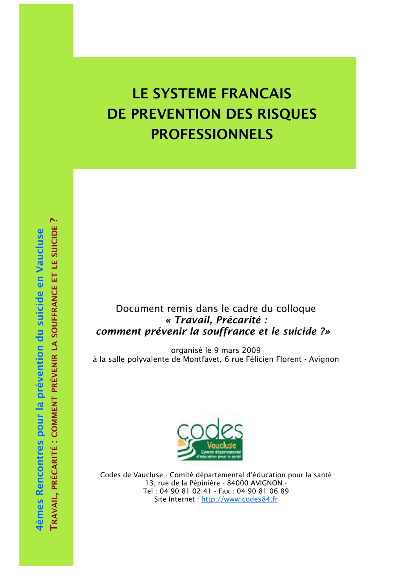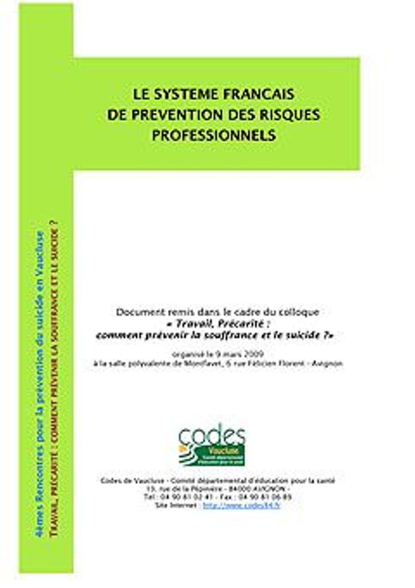 Dans le cadre de son travail de mobilisation des acteurs départementaux de la prévention du suicide, le Codes 84 a organisé le 9 mars 2009 une journée de colloque autour des problématiques de Travail, Précarité et risques suicidaires. Le système français de prévention des risques professionnels étant complexe, il semblait important de présenter les principaux acteurs qui le composent, et ainsi de repérer les structures vers lesquelles employeurs et salariés peuvent se retourner dans la perspective d'amélioration de leurs conditions de travail.