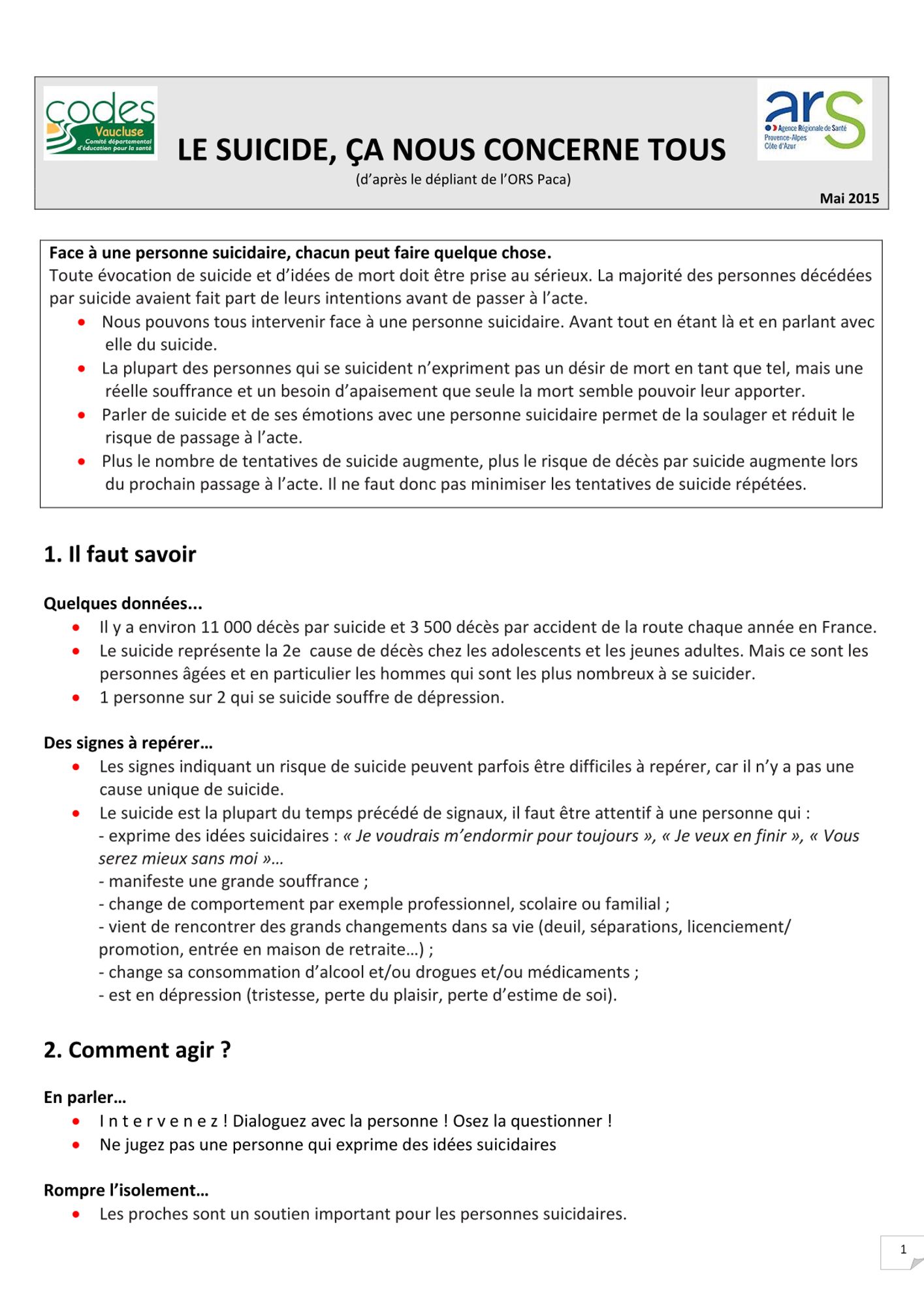 Ce répertoire propose des conseils sur la gestion de la crise suicidaire et les adresses des structures et personnes ressources en Vaucluse. Edité en 2015, il est inspiré du "Guide répertoire sur la prévention et la prise en charge de la crise suicidaire en Provence-Alpes-Côte d'Azur" de l'ORS Paca.
