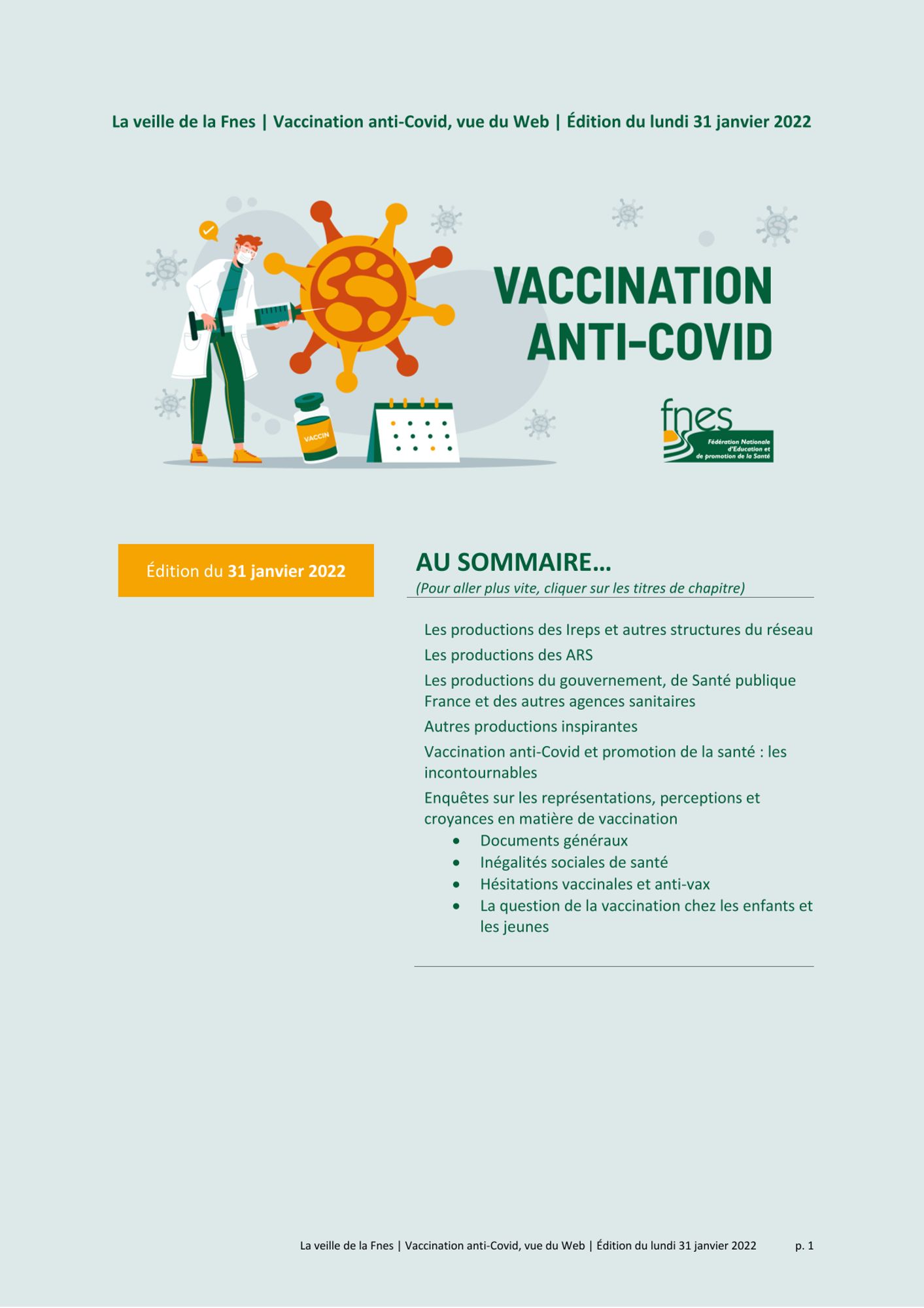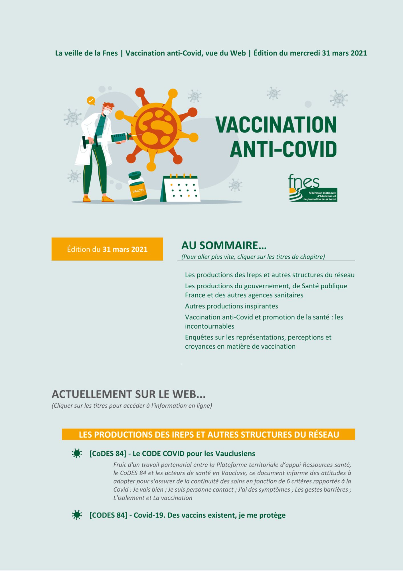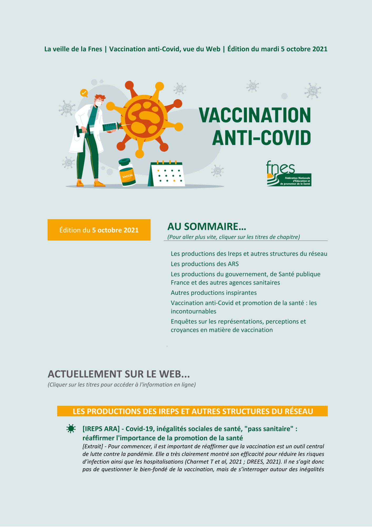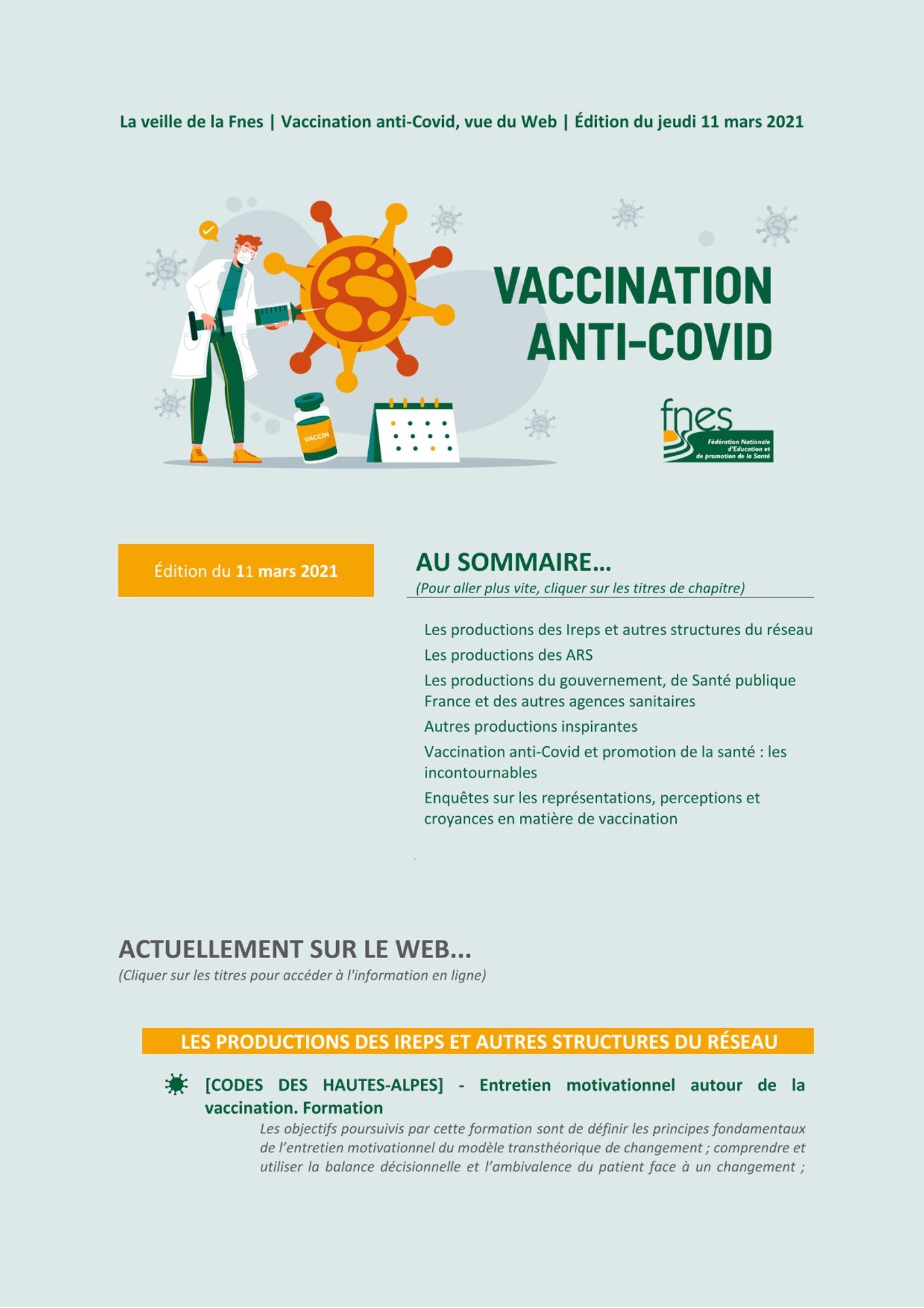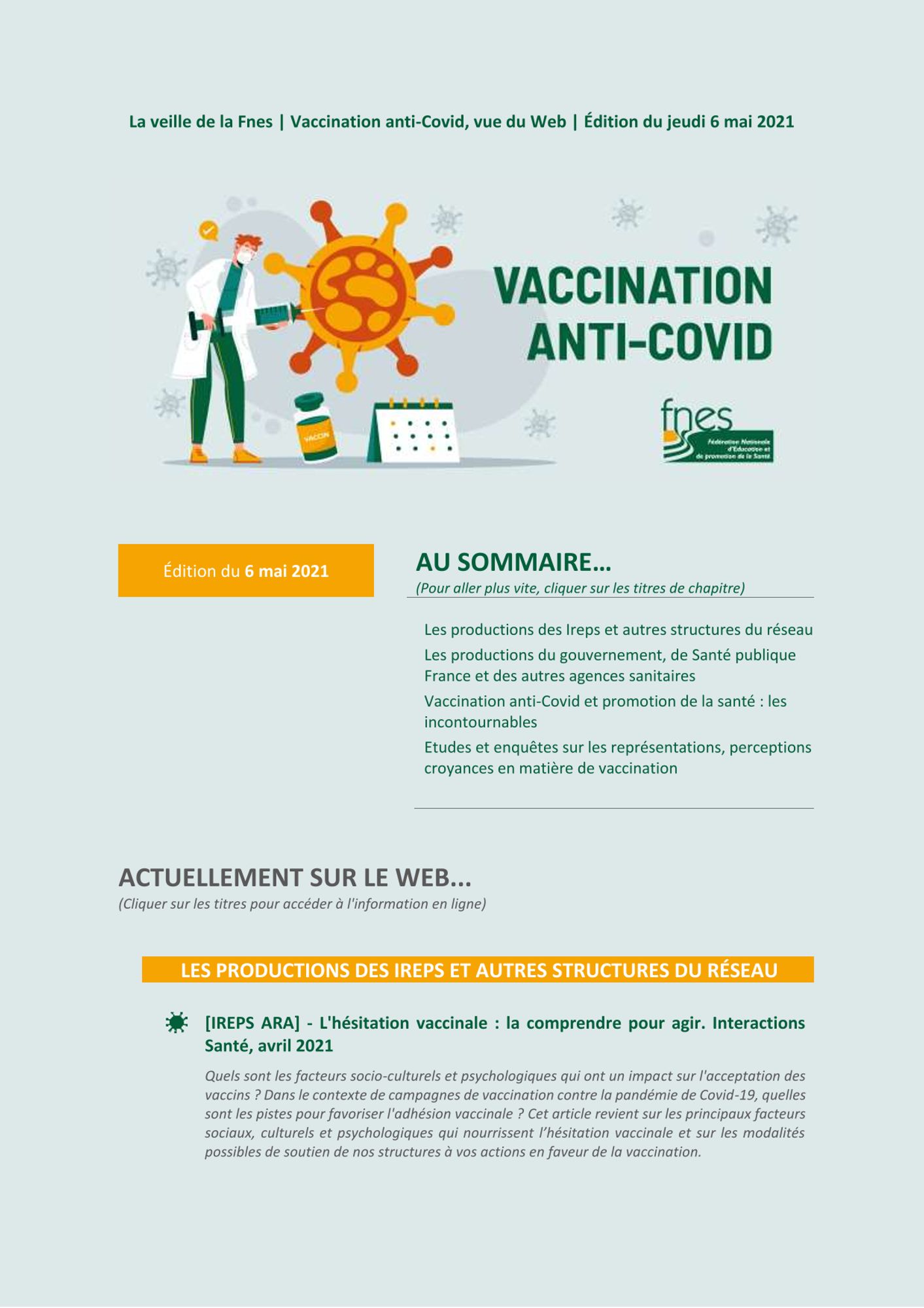 La Fédération nationale d'éducation et de promotion de la santé - FNES édite une lettre de veille sur les productions liées à la vaccination contre la Covid-19.
